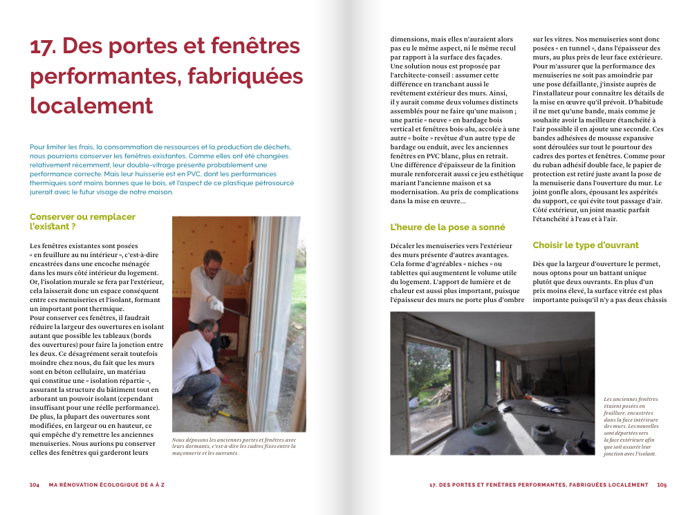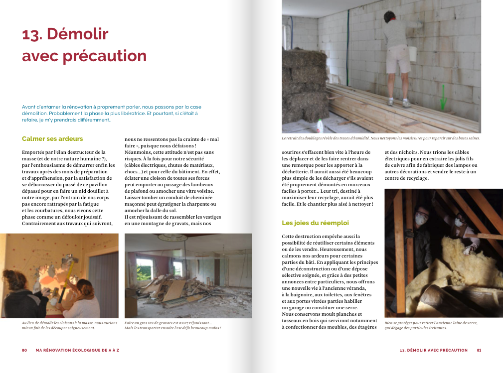 • The works, with very detailed step-by-step guides: insulation of walls with hemp-straw; cladding in untreated wood; local doors and windows; attic insulation in recycled cellulose wadding or wood fiberboard panels; partitions in timber frame and plant fibers, in raw earth bricks, in cob of earth-straw-sawdust; natural paints and clay plasters; flooring in cork, oak and bamboo…