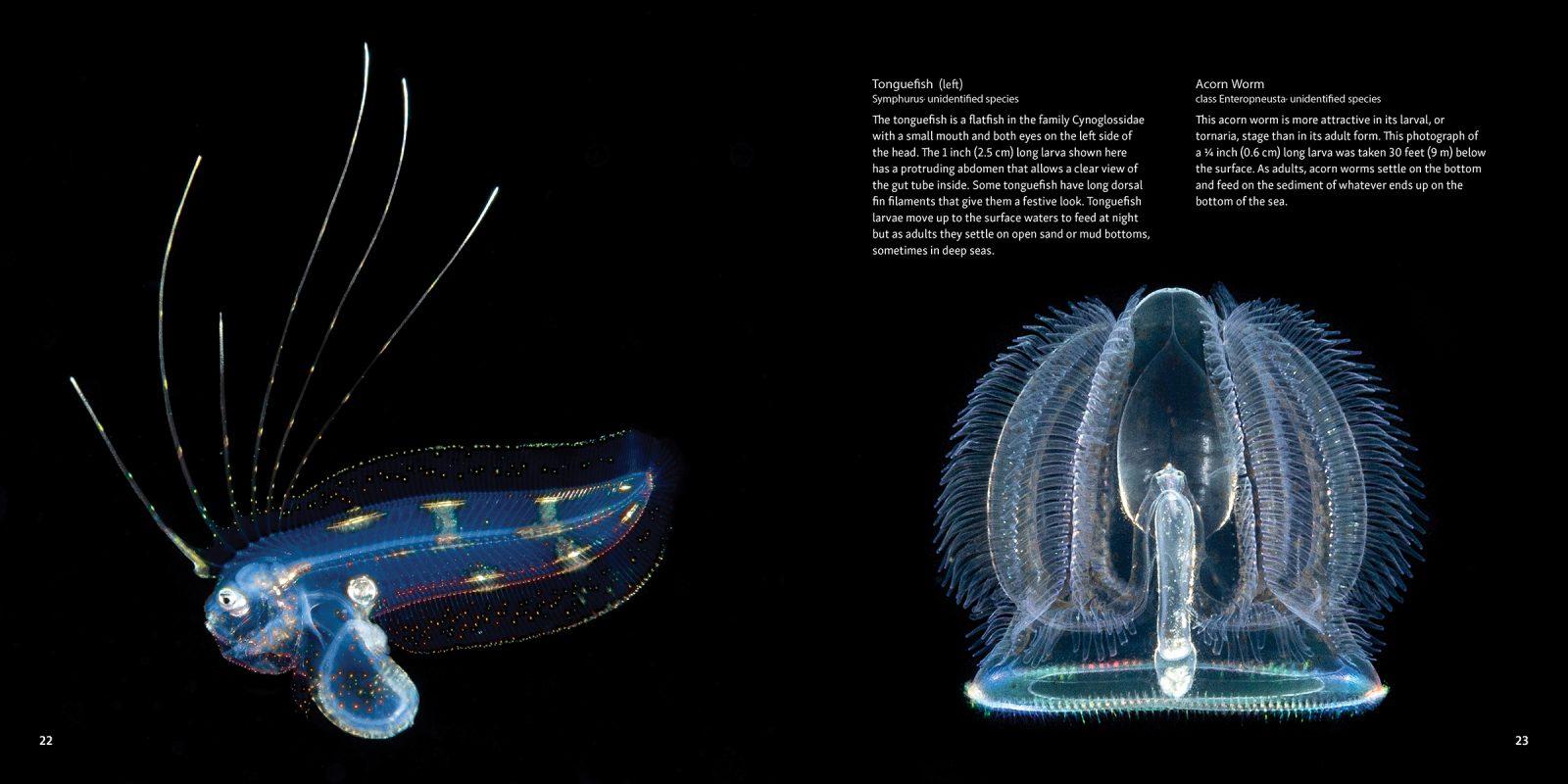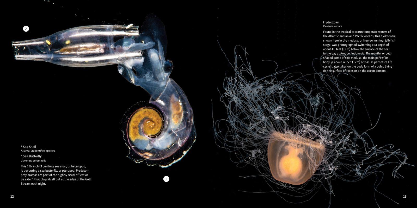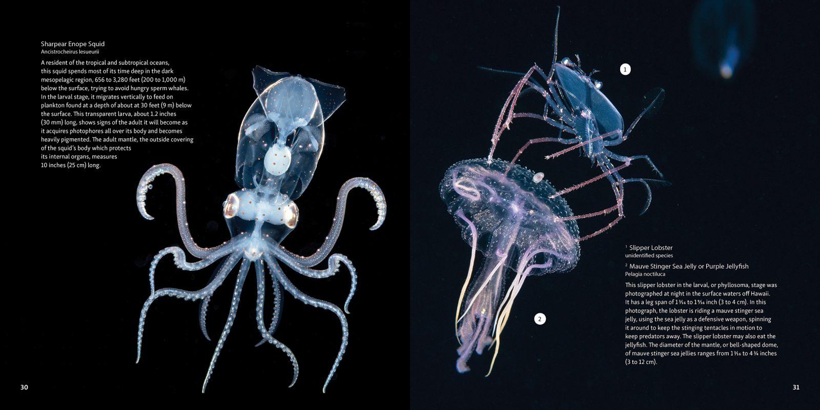 The book organizes the creatures into three parts based on where they live in the ocean. Informative captions accompany the 90 gorgeous photographs of otherworldly creatures.