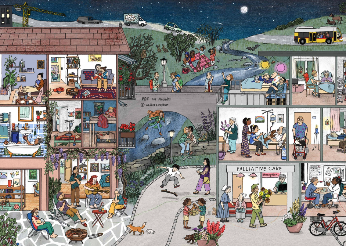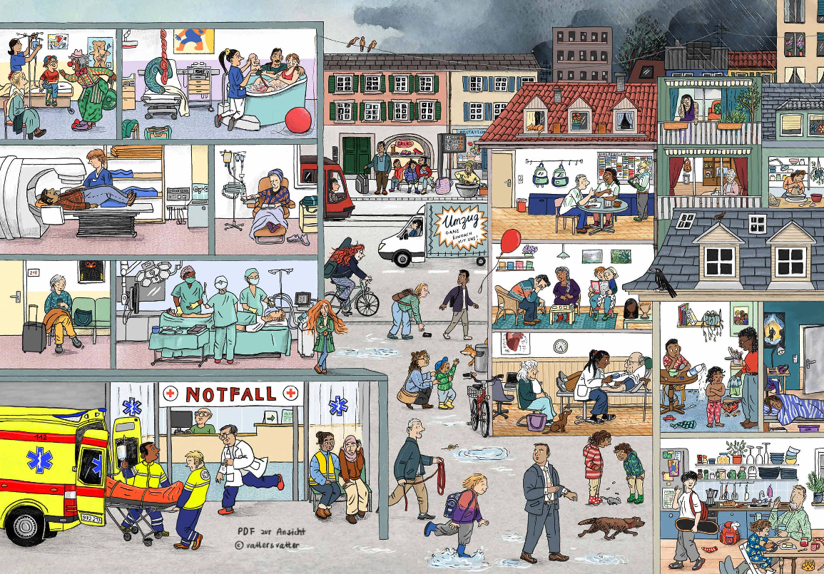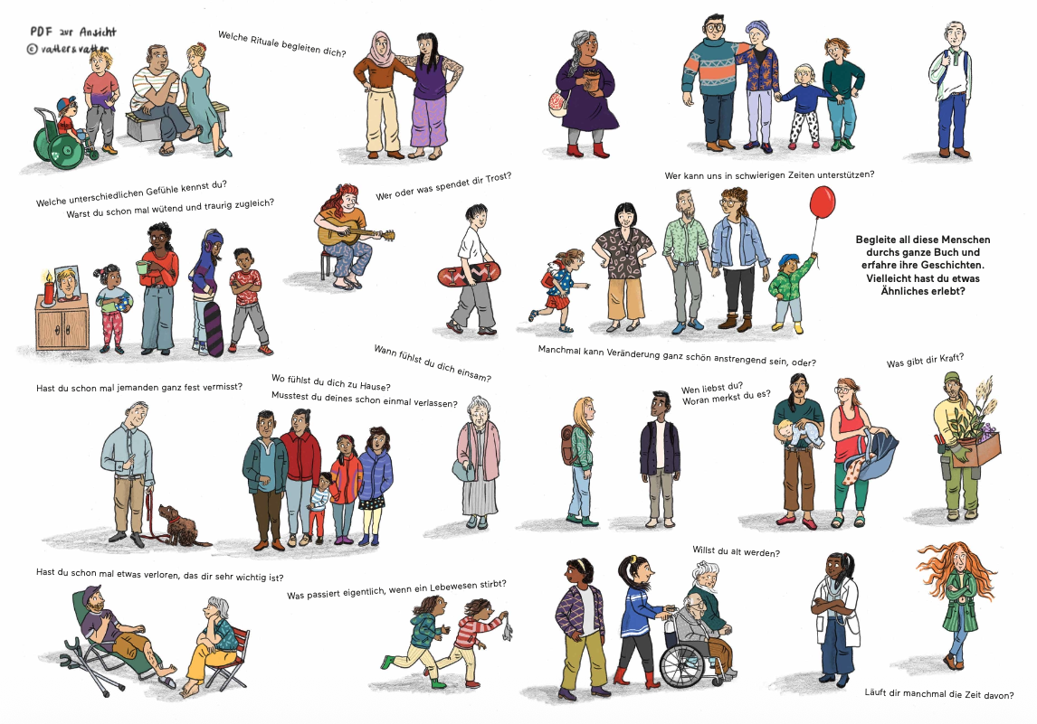 The project initiators, the illustrator Andrea Peter (among others: “The Switzerland Wimmel Book”, “Soso, Many Shoes” etc.) and the palliative physician Sophia Bartorestein (hospital specialist Diaconis, Bern), worked closely with school social workers and many other (specialist) partners to develop this unique Wimmelbook. And it will continue to have activity beyond publication: gradually accompanying materials (also for school use) will be made available on the book website at www.wimmelbuch.ch. In addition, (initially in Switzerland) informational and mediation events will be organized with various partners.