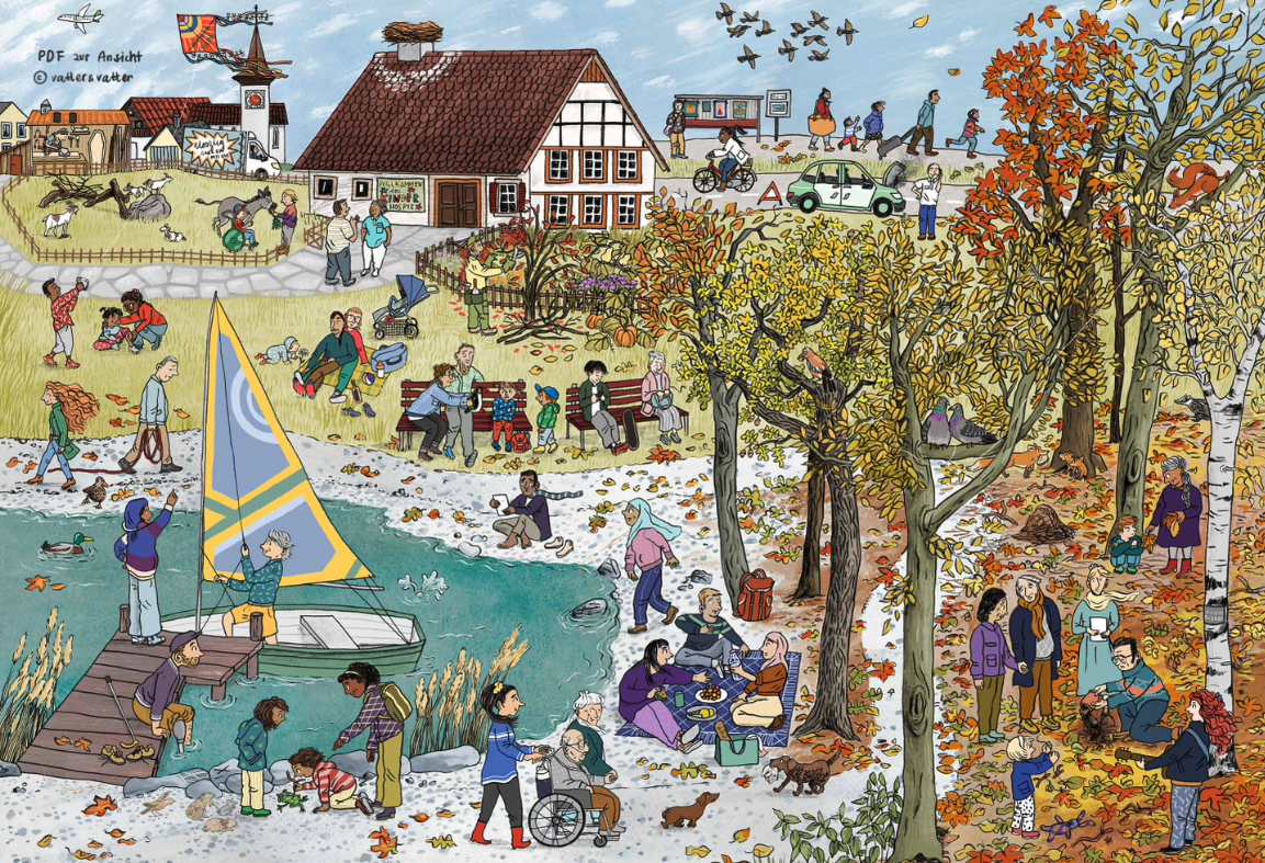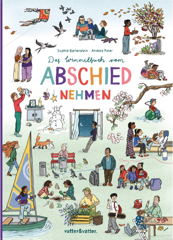 The Wimmel Book of Saying Goodbye addresses the simultaneity of life and suffering and follows a variety of people who must process a farewell over the course of a year: in the six large-format “wimmel” pictures they, amid the bustling everyday life, go through phases and rituals of mourning, repeatedly experience pleasant encounters with their fellow human beings and moments of joy, hope and consolation. Suitable for bereavement support and for all life-interested people from age 3.